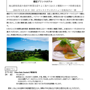 【嬬恋プリンスホテル】 昨年より「オーベルジュリゾート嬬恋」をコンセプトに掲げ、地元食材を使用し、ベジファースト(健康に留意し、野菜を先に食べると血糖値の上昇を抑えることができると言われている)を推奨した「食」、開放感溢れる「温泉」、隣接する「ゴルフ場」など、周辺の自然の恵みを最大限に生かし、心と体に健康と癒しを感じていただけるリゾート「ゴルフのできるオーベルジュ 」を目指して営業しております。 9 月から 11 月の期間も総料理長 飯塚喜隆の監修によるコース料理を 3 種類ご用意し、お客さまのニーズに合わせてお選びいただけます。これらのコースは群馬県産のギンヒカリ、やまと豚や彩り豊かな秋の野菜、フルーツなどを豊富に取り入れ、料理長が味はもとより彩りにも工夫をこらした季節の味覚をお楽しみいただけます。